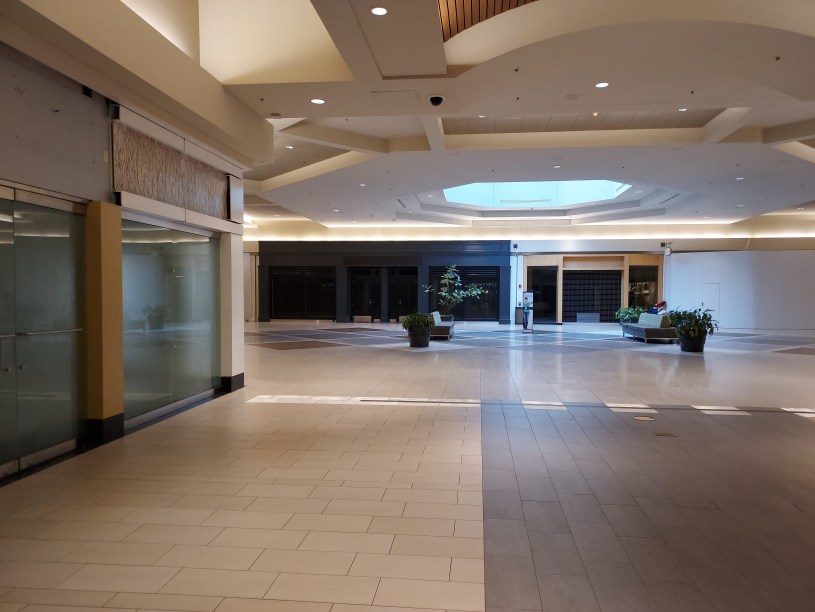 Parking spots wait for vehicles that no longer come, ghostly outlines mark spots where store signs used to hang and the mall’s main interior—shuttered permanently in June 2020—features dozens of display windows with nothing left to sell.